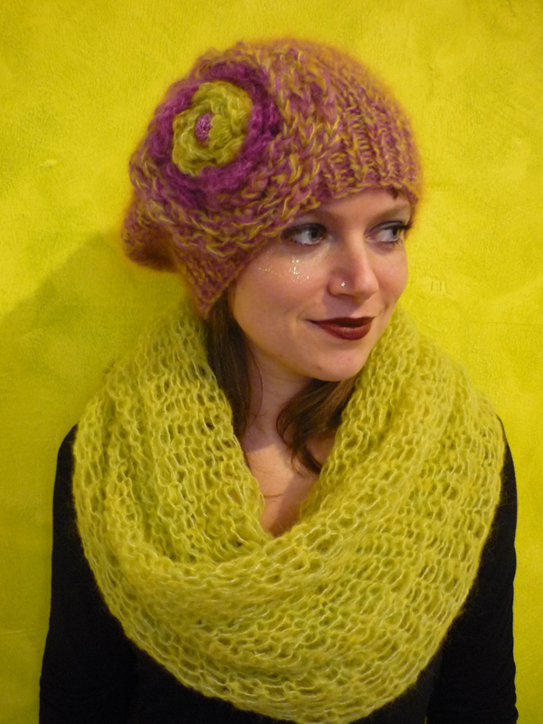 superweiche handgestrickte Mütze aus Kid Mohair und Seide mit großer Blüte und pink glitzerndem Perlenknopfhier mit dem passenden limette Loop kombiniert!
