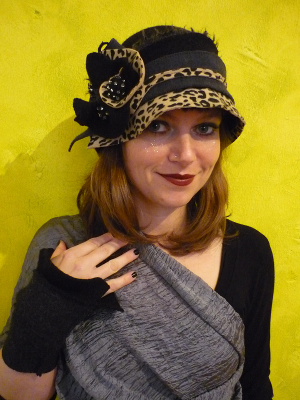 Hut aus weicher reiner Schurwolleschöne anthrazit - schwarz Schattierungen, ein locker fallendes Leorändchen und garniert mit Perlenkugeln