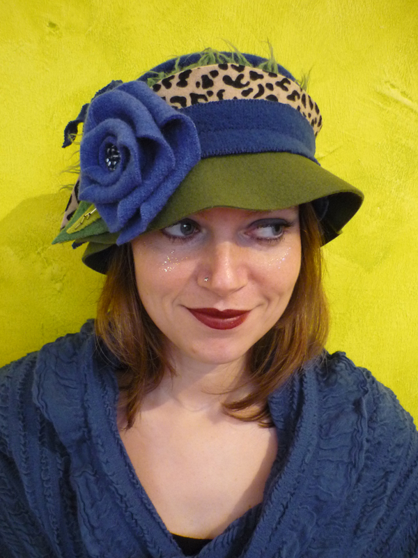 Hut aus weicher reiner Schurwollekecker Mützenhut in jeansblau mit kleinem erbsengrünen Filzrand und grünen Fransen mit Leokante, dazu seitlich zwei toll gedrehte Rosen mit Perlenknopf, fertig ist Hortense!