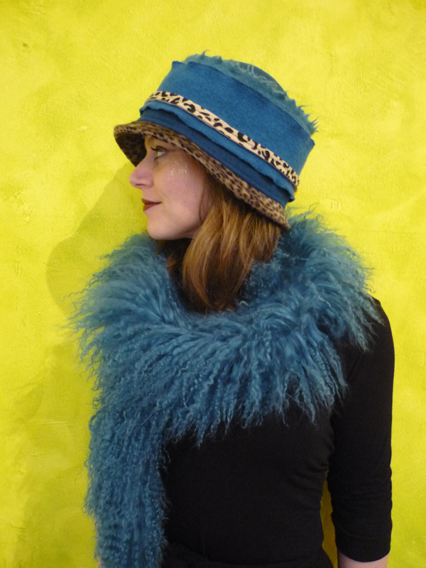 weicher Hut aus reiner Schurwolle mit Gepardenfilztoller weicher Hut mit Gepardenrand, Rosen und einem Mustermix in Blautönen