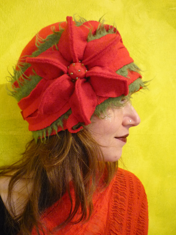 Mütze aus weicher reiner Schurwollesüße Mütze in feuerrot mit vielen apfelgrünen Fransen und großer Anisblüte mit Perlen wunderschön dazu der superweiche feuerrote feine Schurwollschal